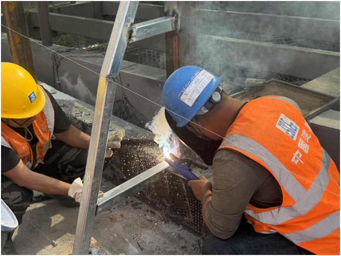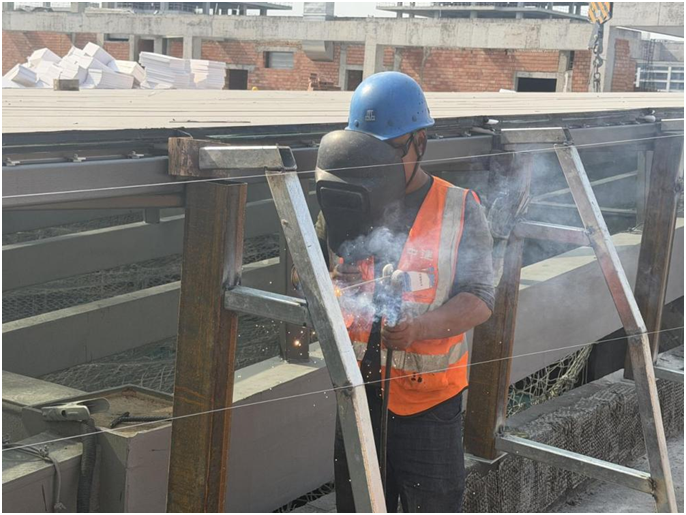 节日期间,项目建设节奏不减、标准不降,屋面采光顶安装、吊篮安装、埋板安装等关键工序同步高效推进。高空作业面上,幕墙安装工们熟练操作设备,精准定位构件;焊工们火花四溅,牢固焊接节点。