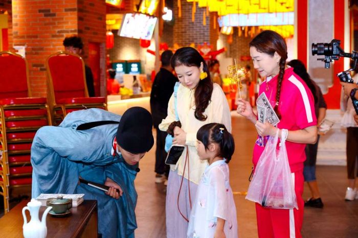 走进东坡宴,惊喜接踵扑面而来:身着宋制服饰的NPC主动递上“身份卡”,持卡至“财神区”便可赚取“银两银票”;转身间,古乐悠扬萦绕耳畔,《苏母教子》情景剧正于中心舞台精彩上演。
