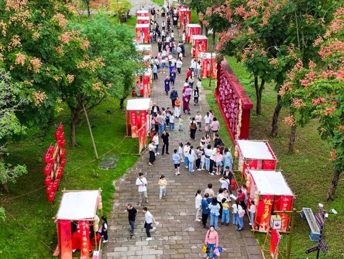 与往年不同,今年的游客不再是旁观者,而是成为主人公深度参与剧情。县衙内,“我在相如当县令”体验活动中,游客身着官服升堂断案,沉浸式感受汉代政务场景;钟楼之下,“卓王孙抛绣球招亲”还原传统婚嫁礼仪,抢到绣球的游客可体验汉式婚礼流程,呼应司马相如与卓文君“凤求凰”爱情IP的当代转化;玉环书院里,“科举那些事”趣味开考,“考生”提笔作答,笔墨间传承千年文脉;武庙之中,“汉赋风云会”座无虚席,游客与“司马相如”“卓文君”对答赋文,赢取文创好礼。