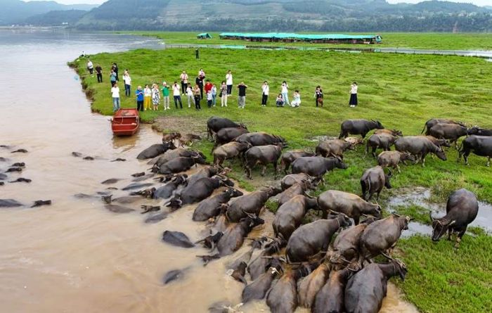 10月7日早晨8点30分,景区的望江楼挤满观景的游客。随着一声呼哨,数百头水牛破波斩浪,冲向江心太阳岛。江面上水花翻涌、牧歌回荡,观景平台上快门声此起彼伏。