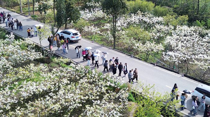 盎然的春意为当地民宿赋予了绝佳的栖居氛围。与其他地方的春日景致不同,这里的春天藏着一份独有的闲适韵味,民宿业主们纷纷敞开院门,在门前摆上雅致茶座,端出地道农家菜和特色农产品。市民和游客赏花累了,便选择一处小院歇脚,一杯清茶配一树繁花,在慢节奏中品味春日惬意。这份质朴真诚的待客之道,让转瞬即逝的“赏花流量”悄然转化为“留客经济”,让春天成为可以住下来细细品味的诗意栖居地。