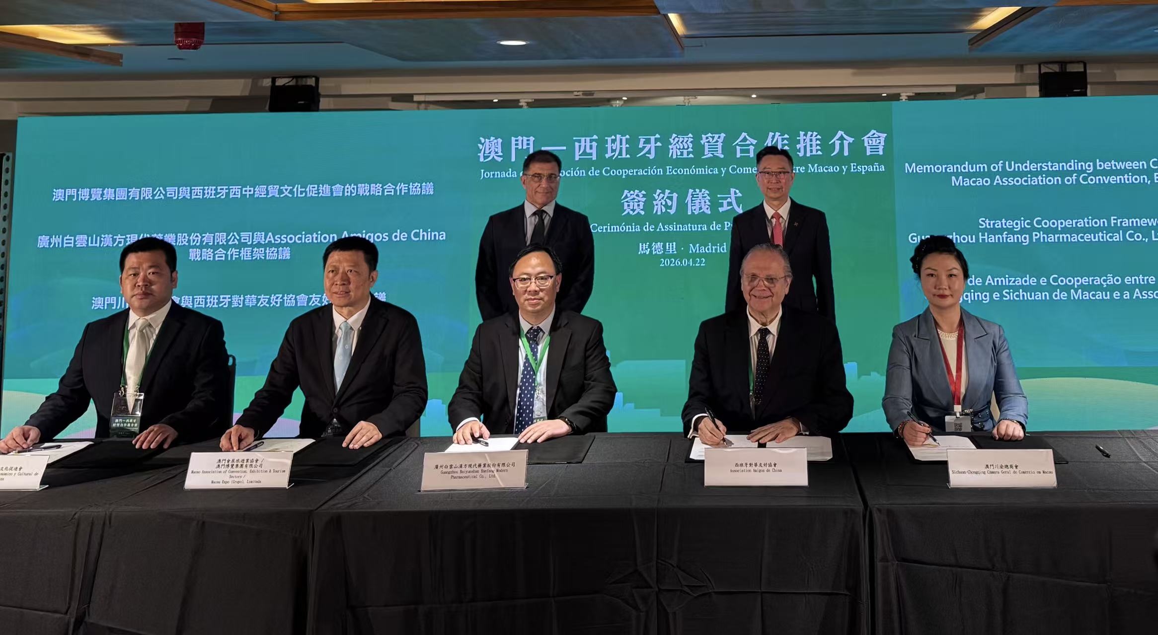 4月20日,在澳门—葡萄牙里斯本经贸合作推介会现场,白云山汉方党委书记、董事长袁诚与葡中工商会秘书长Bernardo Mendia成功签署战略合作协议,正式建立深度合作关系,为公司拓展葡萄牙及葡语国家市场搭建重要桥梁。