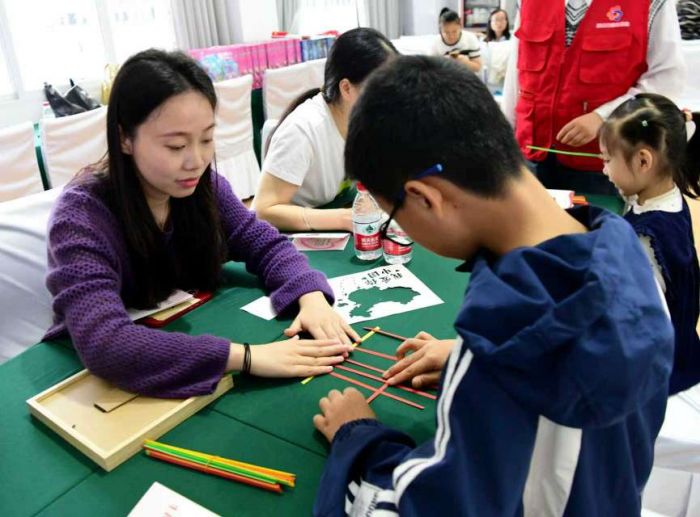 “爱心妈妈”与孩子们制作手工作品(郭明 摄)