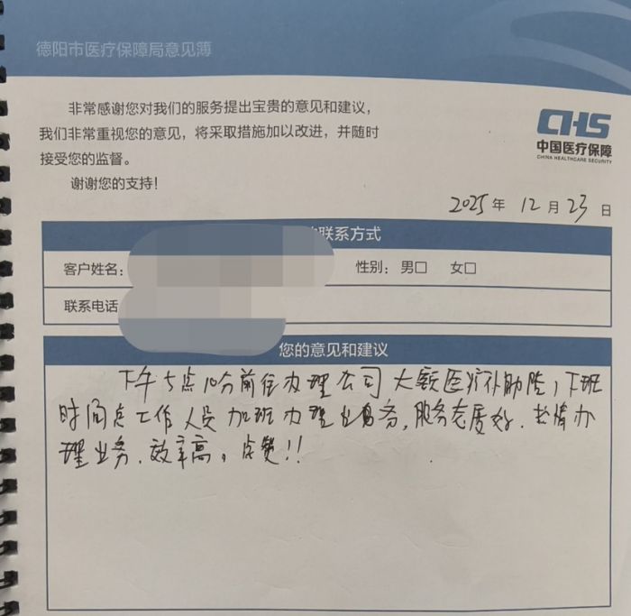 同样,12月23日下午,市民李女士也在意见簿上表达了自己的感谢:“下午5点10分前往医保大厅办理公司大额医疗补助险,下班时间点工作人员加班办理业务,服务态度好,热情办理业务,效率高,点赞。”