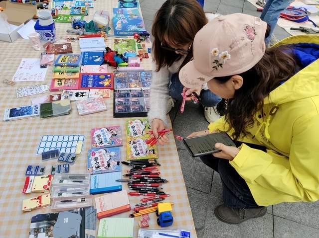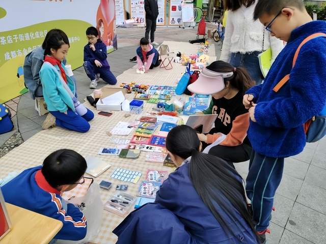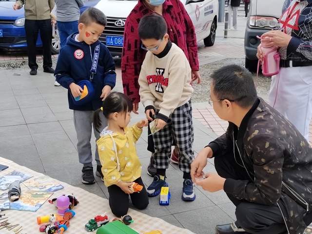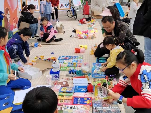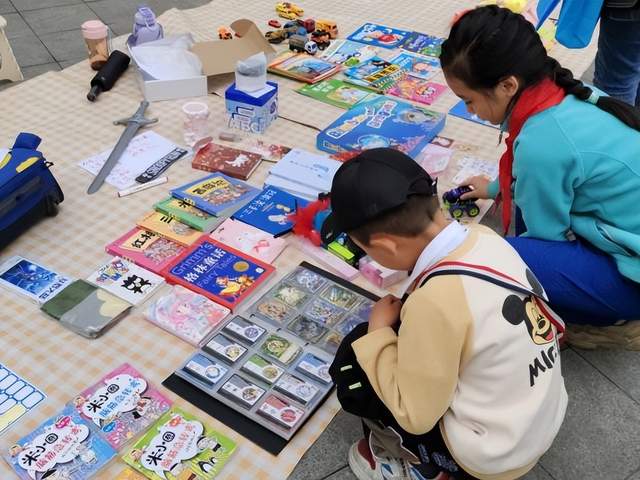 在跳蚤市场区域,“瞧一瞧,看一看,两元一本,买书送车”,跳蚤市场热闹非凡,精美图书、益智玩具、学习用品……小朋友们热情高涨,纷纷化身“小老板”,使出浑身解数招揽顾客,吸引了众多行人围观参与。